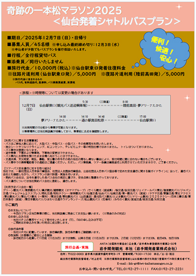 2025年12月7日に岩手県陸前高田市にて開催される『奇跡の一本松マラソン』専用のシャトルバス申し込みのご案内です。