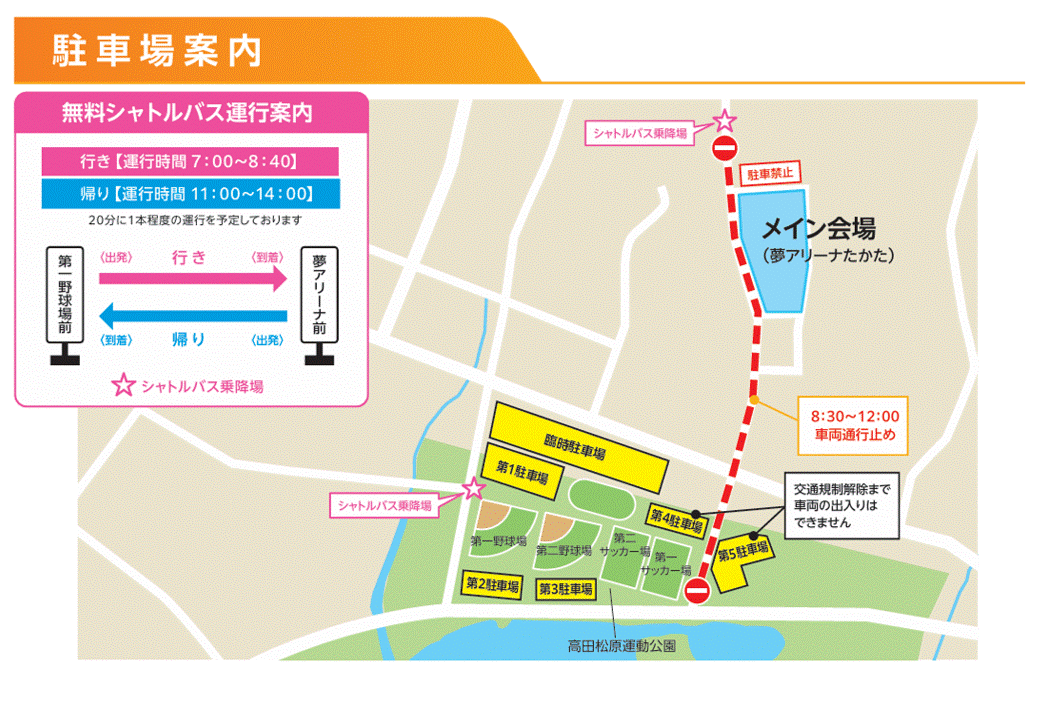 ただし、第4駐車場・第5駐車場については、8:30~競技終了まで駐車場から出られませんのでご注意願います。